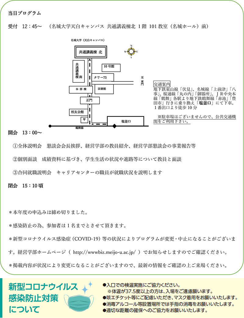 2020(令和2)年度名城大学経営学部地区懇談会について(10/11開催) News一覧2020(令和2)年度名城大学経営学部地区懇談会について(10/11開催) お知らせ 2020年10月1日 2020年10月11日(日)開催予定の地区懇談会の会場及びプログラムが決まりました。
